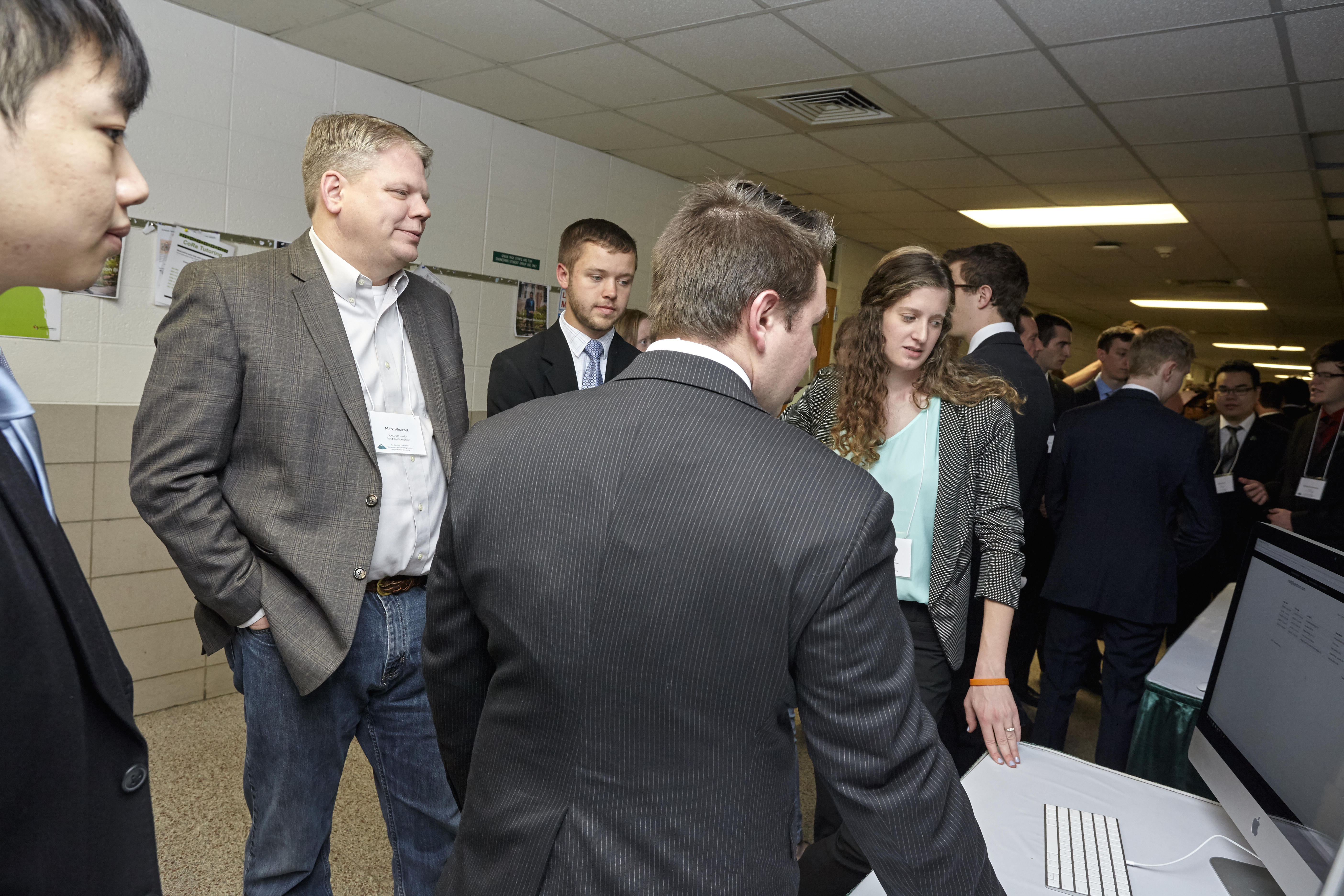 Design Day judge Mark Welscott of Spectrum Health visits with Team Spectrum Health.