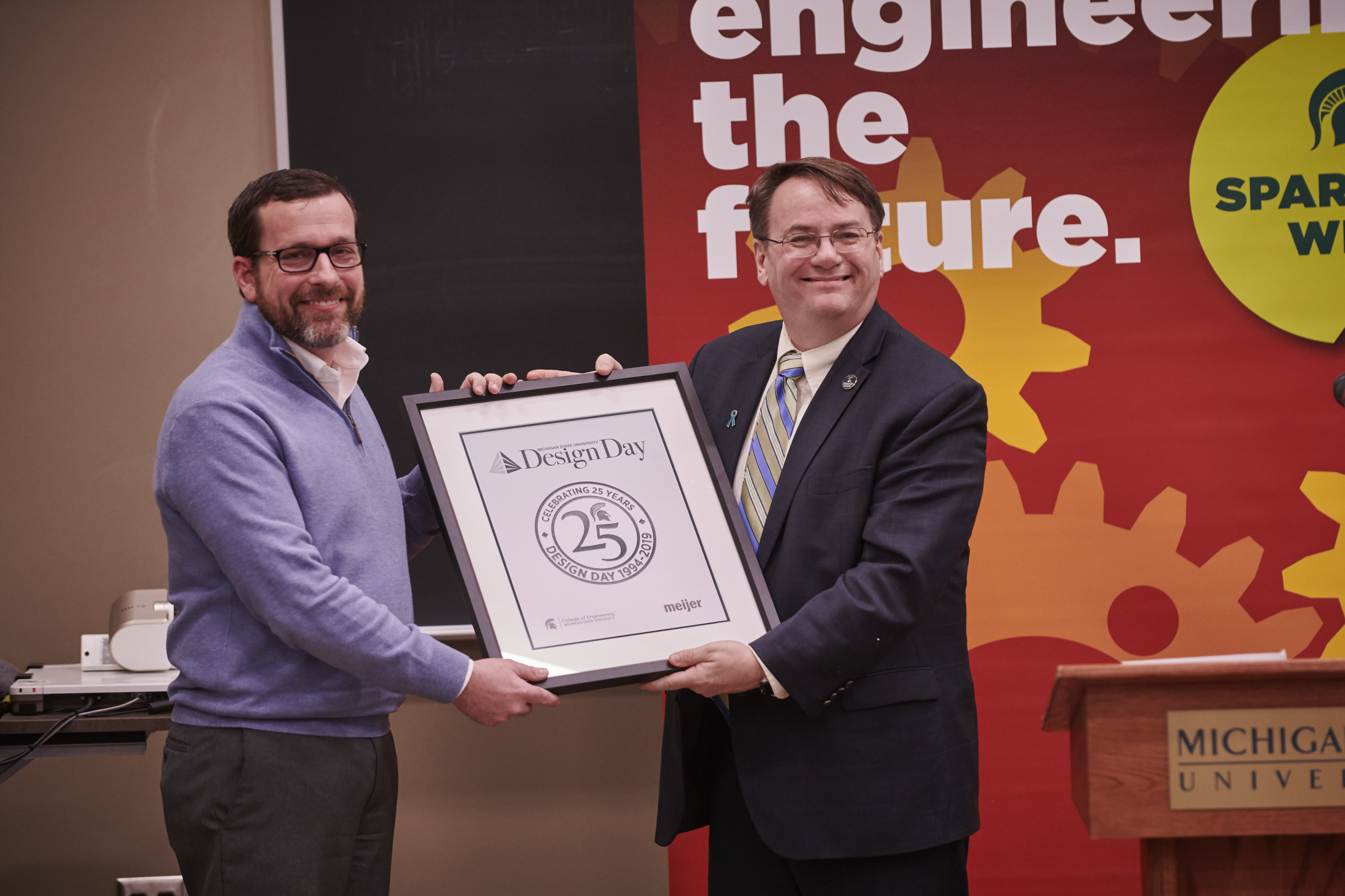 Dean Kempel presents Meijer and Terry Ledbetter with a mememto marking the 25th anniversary of Design Day.