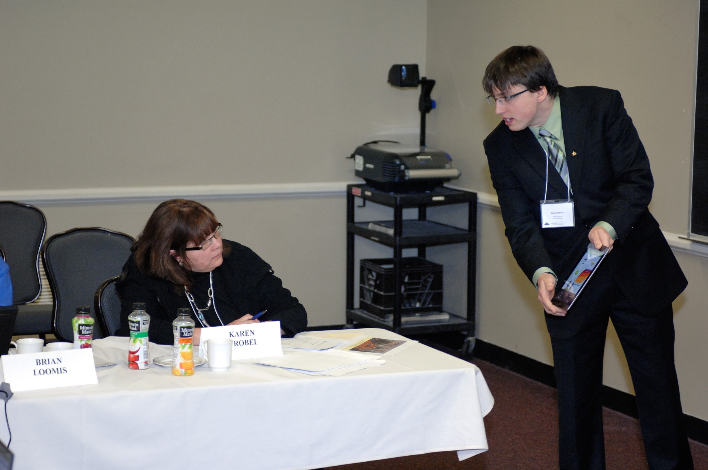 Team Urban Science shows judge Karen Wrobel their iPad Infographics Generator.